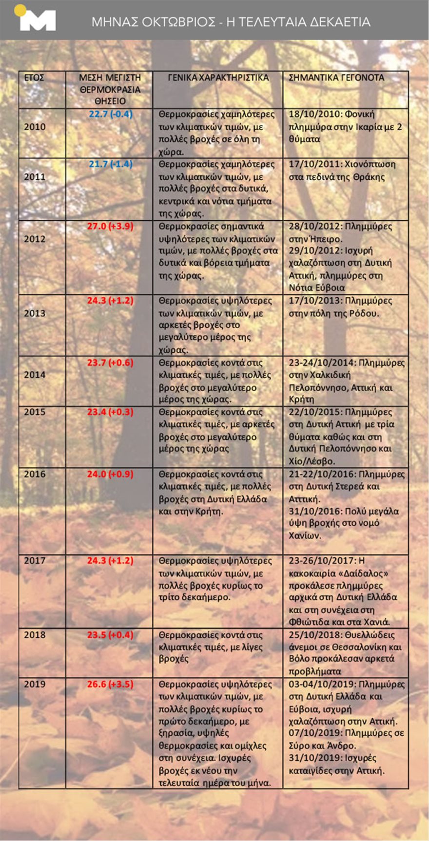 Ο παρακάτω πίνακας δίνει περιληπτικά τις μέσες μέγιστες θερμοκρασίες του Οκτωβρίου από το 2010 και μετά. Με εξαίρεση το 2010 και 2011 όλοι οι υπόλοιποι Οκτώβριοι ήταν θερμότεροι από τις κανονικές τιμές. Τα γενικά χαρακτηριστικά του μήνα καθώς και τα σημαντικότερα γεγονότα δίνονται περιληπτικά.