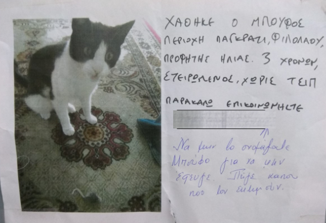 Συγκεκριμένα το μήνυμά έγραφε: «Χάθηκε ο Μπούφος. Περιοχή Παγκράτι, Φιλολάου, Προφήτης Ηλίας. 3 χρονών, στειρωμένος, χωρίς τσιπ», ενώ υπήρχε και ένα τηλέφωνο επικοινωνίας.