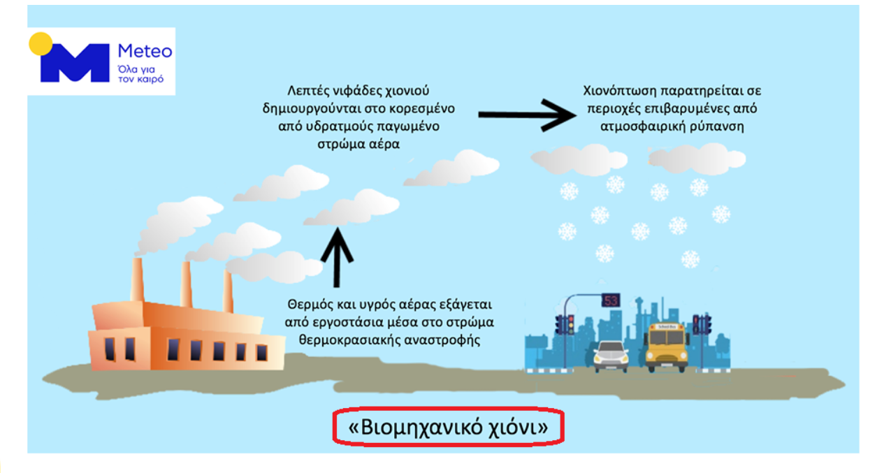 Αυτό το φαινόμενο τεχνητής χιονόπτωσης παρατηρούν οι κάτοικοι της Βόρειας Γαλλίας, το οποίο ονομάζεται «Βιομηχανικό χιόνι» και έχει παρατηρηθεί σε πολλές χώρες που αντιμετωπίζουν πρόβλημα ατμοσφαιρικής ρύπανσης, όπως οι Κάτω Χώρες, η Γερμανία, οι ΗΠΑ, ο Καναδάς, η Κίνα και η Ρωσία. Στη χώρα μας πολύ πιθανό το φαινόμενο να έχει εμφανιστεί στα λεκανοπέδια της Πτολεμαΐδας και της Μεγαλόπολης όπου λειτουργούν εργοστάσια παραγωγής ενέργειας.