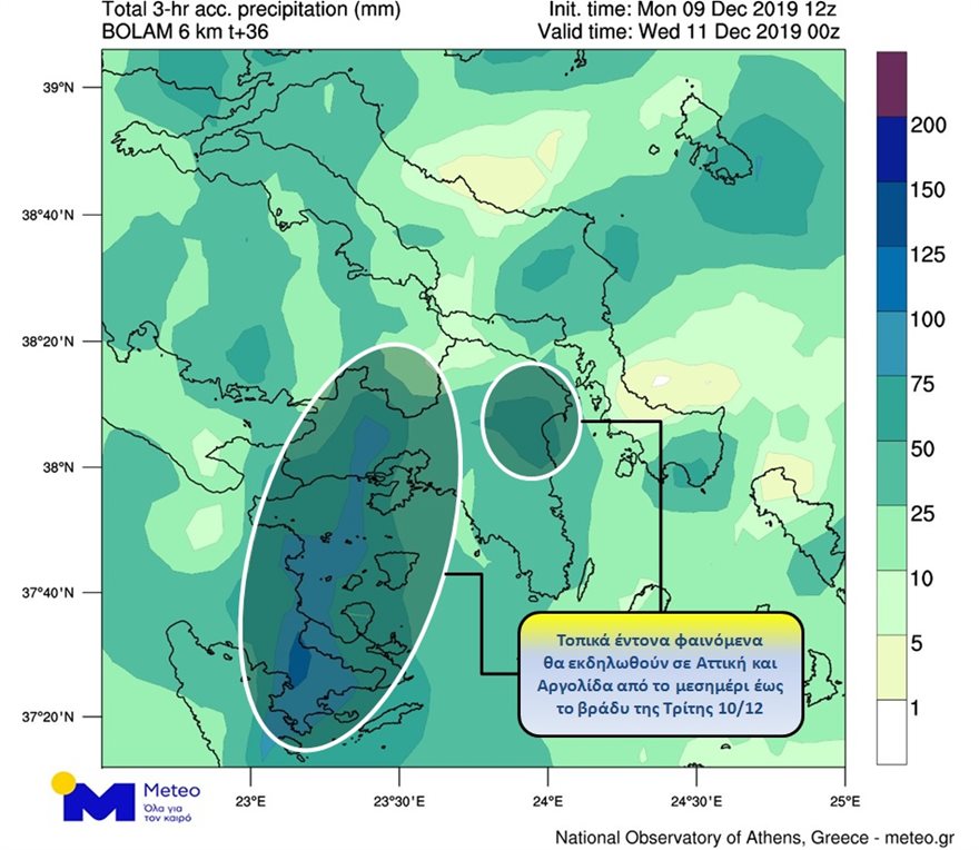 Στις περιοχές όπου εκδηλώνονται τοπικά ισχυρές βροχές και καταιγίδες κατά τη διάρκεια της Τρίτης (μετά το μεσημέρι έως και το βράδυ) συμπεριλαμβάνονται ο νομός Αττικής και η πόλη της Αθήνας. Αργά το βράδυ τα φαινόμενα πρόσκαιρα θα σταματήσουν.