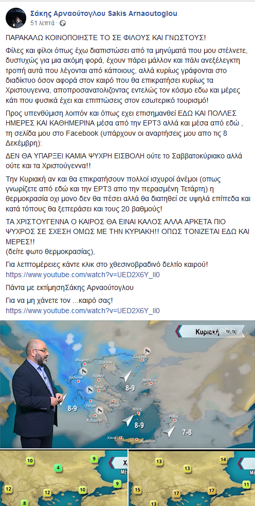«Φίλες και φίλοι όπως έχω διαπιστώσει από τα μηνύματά που μου στέλνετε, δυστυχώς για μια ακόμη φορά, έχουν πάρει μάλλον και πάλι ανεξέλεγκτη τροπή αυτά που λέγονται από κάποιους, αλλά κυρίως γράφονται στο διαδίκτυο όσον αφορά στον καιρό που θα επικρατήσει κυρίως τα Χριστουγεννα, αποπροσανατολιζοντας εντελώς τον κόσμο εδω και μέρες κάτι που φυσικά έχει και επιπτώσεις στον εσωτερικό τουρισμό!