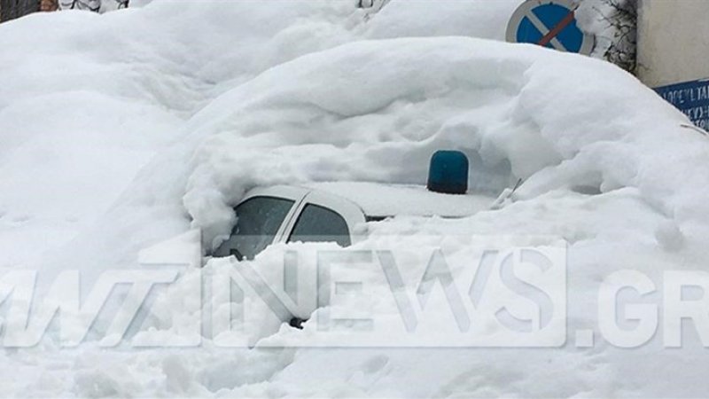 Το ύψος του χιονιού ξεπερνά το ένα μέτρο. Δεκάδες αυτοκίνητα έχουν θαφτεί κάτω από το χιόνι, όπως και το περιπολικό του τοπικού Αστυνομικού Τμήματος.