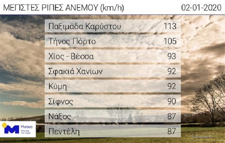 Επίσης, πολύ θυελλώδεις βόρειοι άνεμοι πνέουν στο Αιγαίο με ισχυρότατες ριπές που στην Παξιμάδα Καρύστου έφτασαν τα 113 km/h. Στον δεύτερο πίνακα μπορείτε να δείτε τους 8 σταθμούς που κατέγραψαν τις ισχυρότερες ριπές ανέμου έως τις 20:00 το βράδυ.
