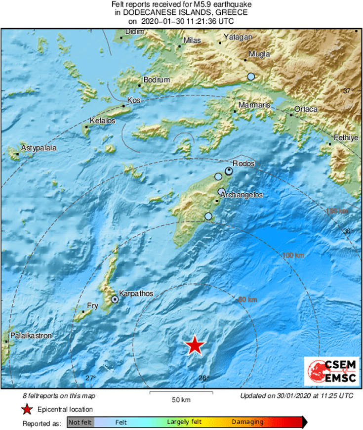 Επίσης, σεισμική δόνηση μεγέθους 5,2 βαθμών της κλίμακας Ρίχτερ σημειώθηκε και τα ξημερώματα της Πέμπτης (30/01) νοτιοδυτικά της Καρπάθου.