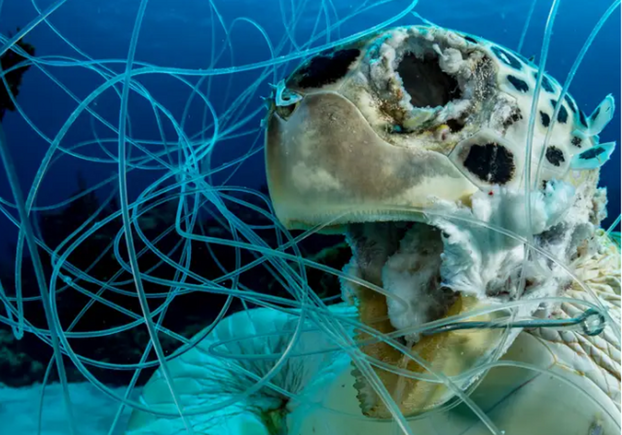Θλίψη προκαλεί η φωτογραφία που απεικονίζει μία νεκρή θαλάσσια χελώνα, εγκλωβισμένη από μεταλλικό πλέγμα πετονιάς αλιείας.