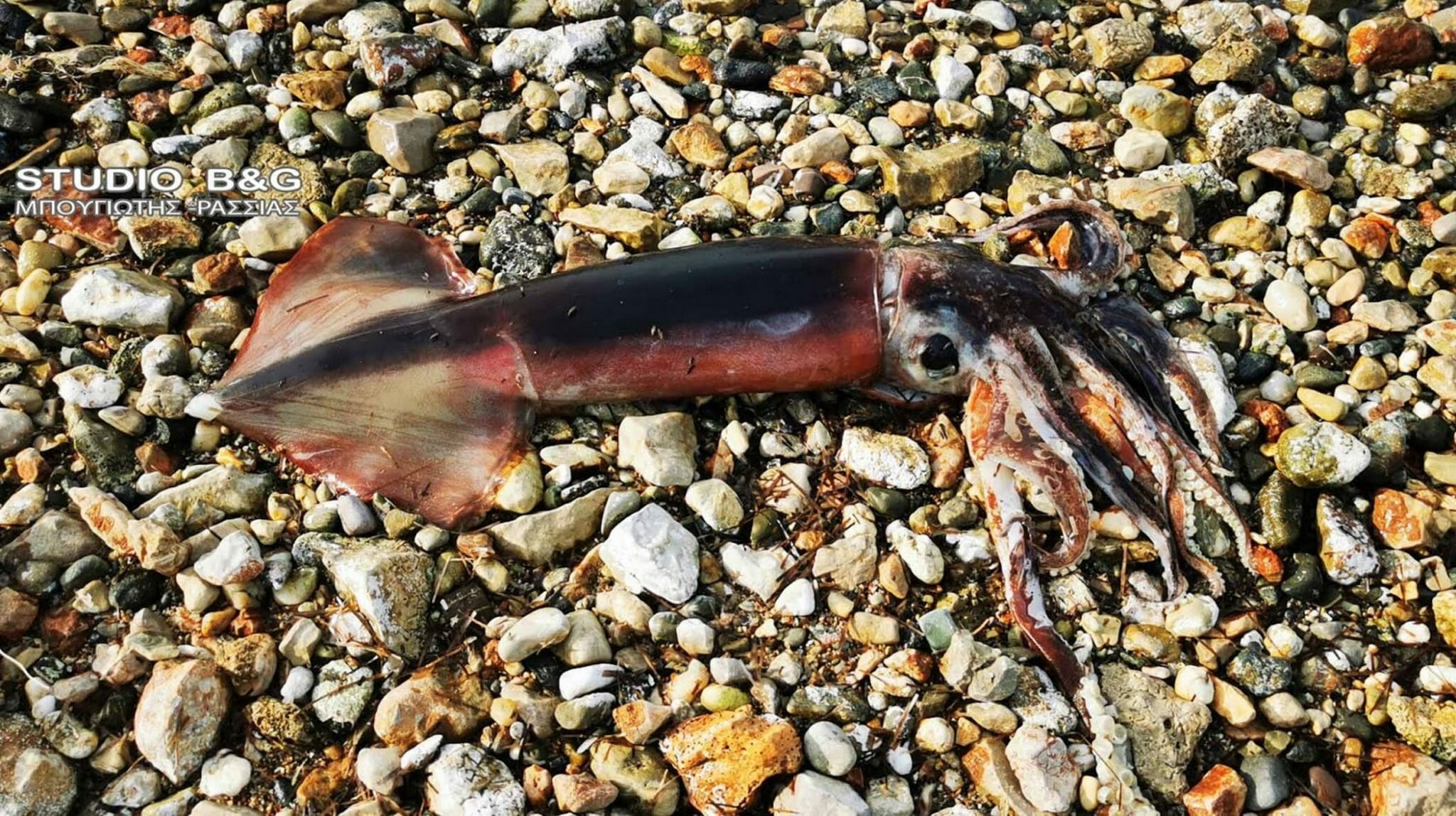 Ένα τεράστιο καλαμάρι πιάστηκε από ερασιτέχνη ψαρά στην παραλία Καραθώνας στο Ναύπλιο την Τρίτη (11.02.2020).