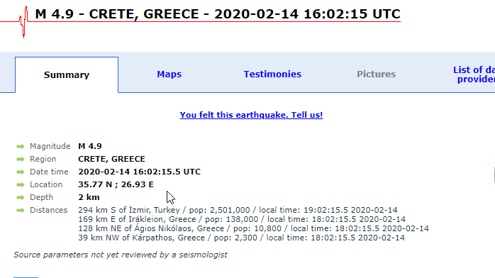Σύμφωνα με την πρώτη εκτίμηση του Ευρωμεσογειακού Ιντιστούτου, ο σεισμός ήταν μεγέθους 4,9 Ρίχτερ με εστιακό βάθος τα 2 χλμ κοντά στην Κρήτη.