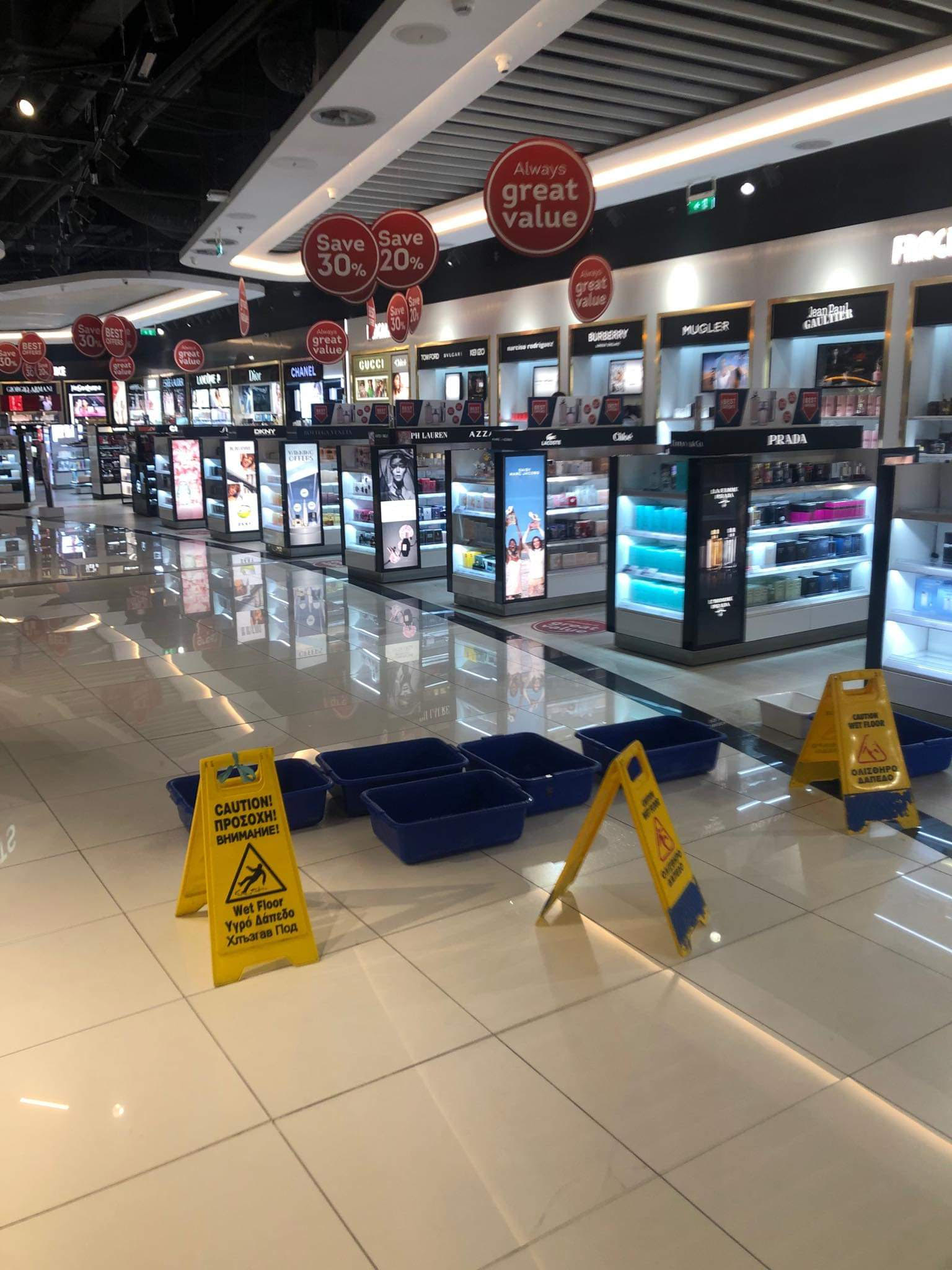 Οι υπεύθυνοι του αεροδρομίου τοποθέτησαν και ειδικές σημάνσεις, προειδοποιώντας τον κόσμο για την ολισθηρότητα του διαδρόμου, εξαιτίας της βροχόπτωσης.