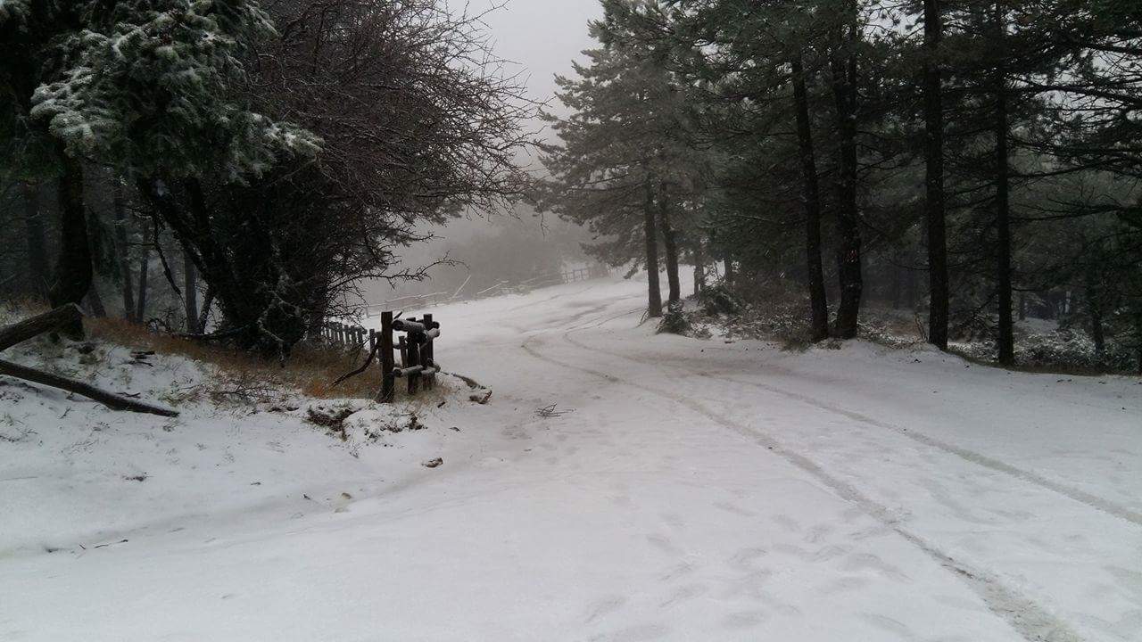 Στα λευκά ντύθηκε η Πάρνηθα, καθώς χιονίζει από νωρίς το πρωί.