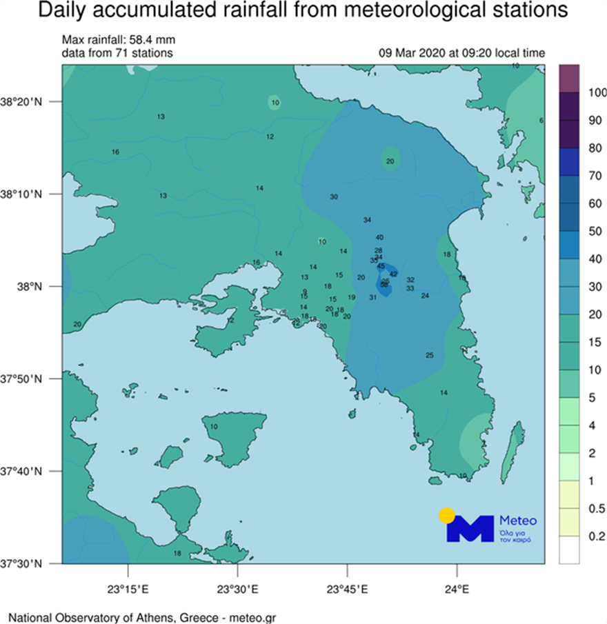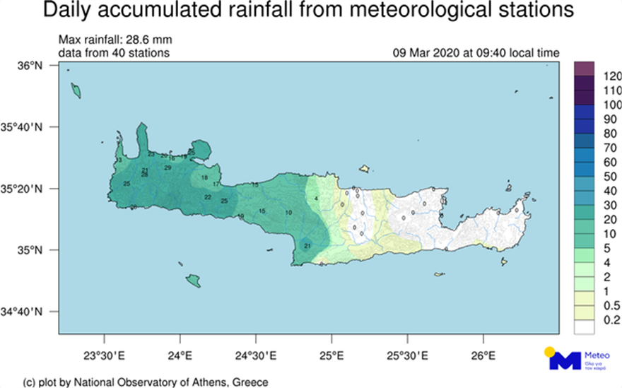 Στους χάρτες που ακολουθούν παρουσιάζεται η γεωγραφική κατανομή των βροχοπτώσεων έως τις 09:20 στο νομό Αττικής και στην Κρήτη, σύμφωνα με τις καταγραφές 71 μετεωρολογικών σταθμών του Μετεωρολογικού και Κλιματικού Παρατηρητηρίου Αττικής του Εθνικού Αστεροσκοπείου Αθηνών / meteo.gr και 40 μετεωρολογικών σταθμών του Μετεωρολογικού και Κλιματικού Παρατηρητηρίου Κρήτης.