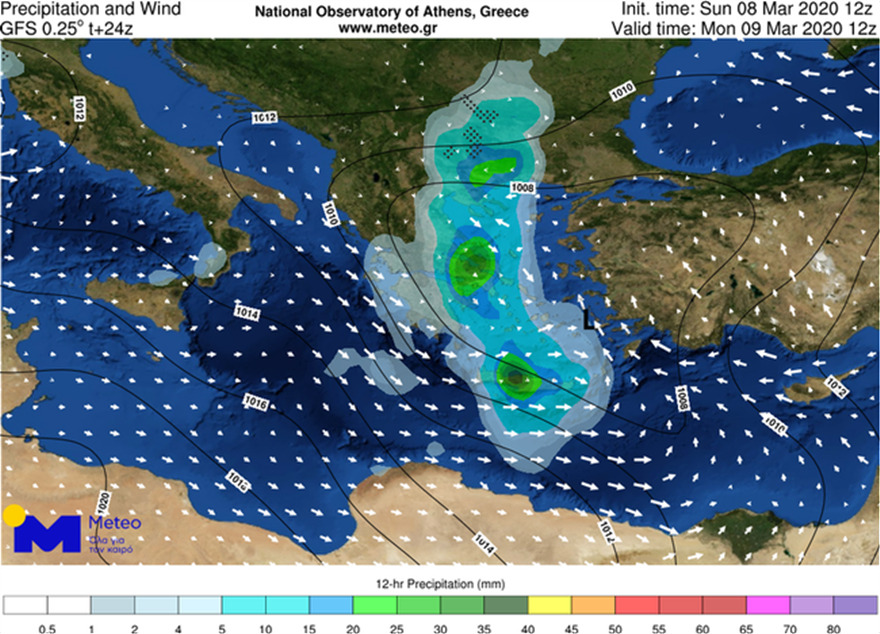 Στους χάρτες που ακολουθούν παρουσιάζεται ο ολικός υετός (βροχές / καταιγίδες) που αναμένεται από τη νύχτα της Κυριακής 08/03 προς Δευτέρα 09/03 έως το μεσημέρι της Δευτέρας 09/03 (επάνω) και από το μεσημέρι έως το βράδυ της Δευτέρας 09/03 (κάτω).