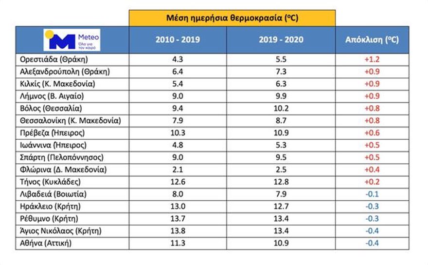 «Πρωταθλήτρια» του φετινού θερμού χειμώνα ανακηρύσσεται η Ορεστιάδα, όπου η μέση ημερησία θερμοκρασία βρέθηκε υψηλότερη κατά 1,2°C της αντίστοιχης κλιματικής τιμής της περιόδου 2010 – 2019. Υψηλές θετικές αποκλίσεις, κοντά στον 1°C παρατηρήθηκαν επίσης στους σταθμούς της Αλεξανδρούπολης, του Κιλκίς, της Λήμνου, του Βόλου και της Θεσσαλονίκης, ενώ μικρότερες θετικές αποκλίσεις, μεταξύ 0,2 – 0,6°C, καταγράφηκαν στην Ήπειρο (Πρέβεζα, Ιωάννινα), τη Δ. Μακεδονία (Φλώρινα), την Πελοπόννησο (Σπάρτη) και τις Κυκλάδες (Τήνος).