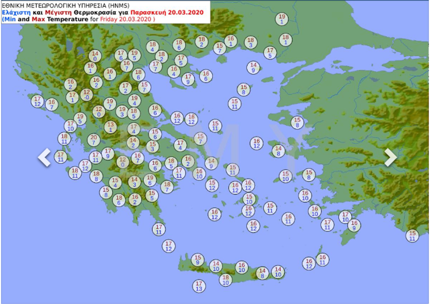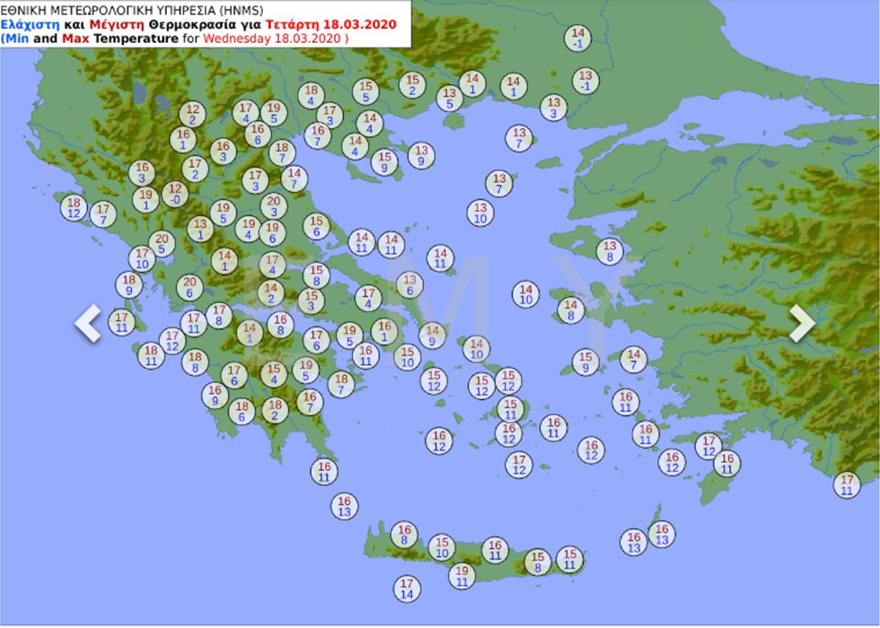 Η θερμοκρασία στη Δυτική Μακεδονία θα κυμανθεί από 0 έως 16, στην υπόλοιπη Μακεδονία και στη Θράκη από 2 έως 16, στα υπόλοιπα ηπειρωτικά από 4 έως 18, στα νησιά του Ιονίου από 7 έως 17, στα νησιά του Βορείου Αιγαίου από 4 έως 14, στα νησιά του υπολοίπου Αιγαίου από 5 έως 14 (στη Ρόδο τοπικά έως 16) και στην Κρήτη από 5 έως 17.