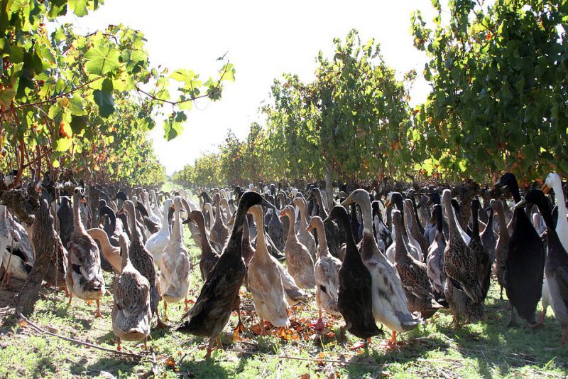 Οι πάπιες απαλλάσσουν τα αμπέλια από σαλιγκάρια και έντομα, γεγονός που επιτρέπει στον αμπελώνα να χρησιμοποιεί λιγότερα φυτοφάρμακα βελτιώνοντας την ποιότητα του κρασιού που παράγει. Οι πάπιες που απελευθερώνονται στο κτήμα ανήκουν στο είδος της πάπιας ινδικού δρομέα (Indian Runner duck), που είναι ταχύτερες σε σχέση με άλλα είδη πάπιας γιατί τρέχουν αντί να περπατούν.