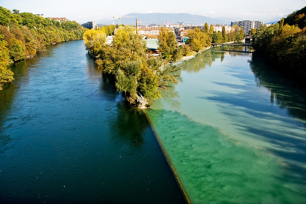 Ο ποταμός Ροδανός από τη μία και ο ποταμός Arve από την άλλη ενώνονται στη Γενεύη της Ελβετίας, σε μια εκπληκτική φυσική «συνάντηση» ανάμεσα σε διαφορετικού χρώματος νερά. Ο ένας έρχεται από αριστερά και ο άλλος από δεξιά αντίστοιχα, συνθέτοντας ένα από τα ωραιότερα τοπία του πλανήτη!