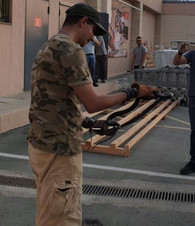 Στη φωτογραφία φαίνεται ο ειδικός για φίδια Αντρέας Κουρίδης καθώς απομακρύνει ένα φίδι από υπεραγορά: