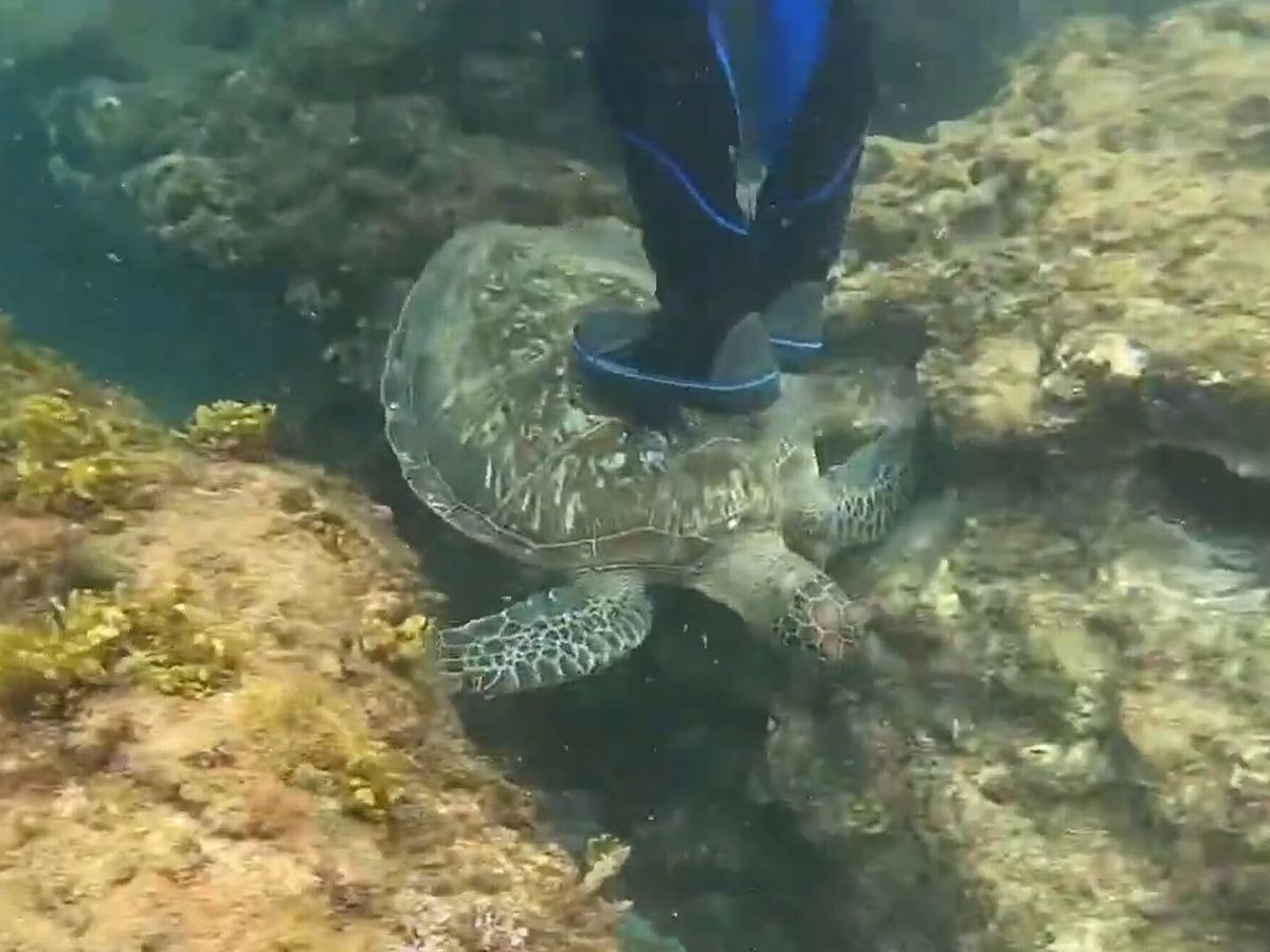 Πλάνα από έναν κολυμβητή που βρισκόταν ταυτόχρονα στην περιοχή δείχνει, πώς ένας από τους τουρίστες φτάνει κάτω για να χτυπήσει το κέλυφος της χελώνας της πράσινης θάλασσας. Στη συνέχεια, χαμηλώνει τα πόδια του και στέκεται πάνω στην άτυχη χελώνα σαν να πατά πάνω σε hoverboard. Η κακοποιημένη χελώνα φαίνεται να βρίσκεται σε κίνδυνο καθώς χρησιμοποιεί τα πτερύγια της για να στηριχθεί σε ένα κοντινό βράχο.