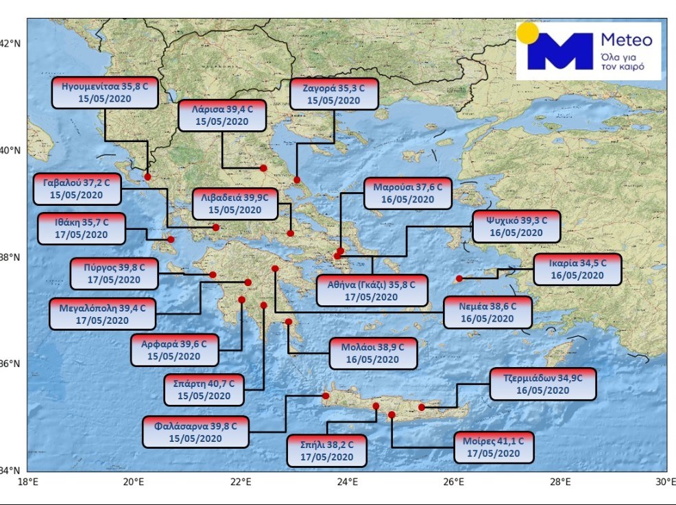 Νέα ρεκόρ μέγιστων θερμοκρασιών για τον μήνα Μάιο καταγράφηκαν από το δίκτυο αυτόματων μετεωρολογικών σταθμών του Εθνικού Αστεροσκοπείου Αθηνών/meteo.gr, κατά το κύμα καύσωνα που επηρέασε τη χώρα μας το διάστημα 15-19/05/2020.