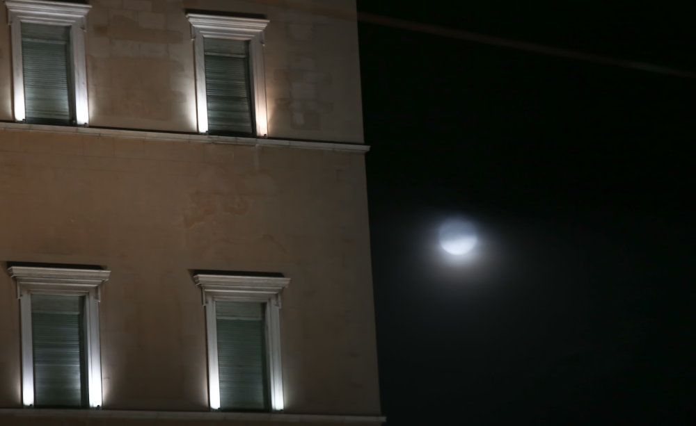 Εντυπωσιακές είναι οι εικόνες από όλη την Ελλάδα από το σπάνιο «διπλό» φαινόμενο της Πανσέληνου με έκλειψη παρασκιάς.