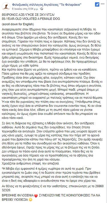 Οργή προκαλεί η καταγγελία του Φιλοζωικού Συλλόγου Αιγιάλειας, «Τα φιλαράκια» για έναν ηλικιωμένο, περίπου 85 ετών, που φέρεται να κακοποίησε σεξουαλικά μια σκυλίτσα σε ορεινό χωριό της Αιγιάλειας, κοντά στις Νεραντζιές.