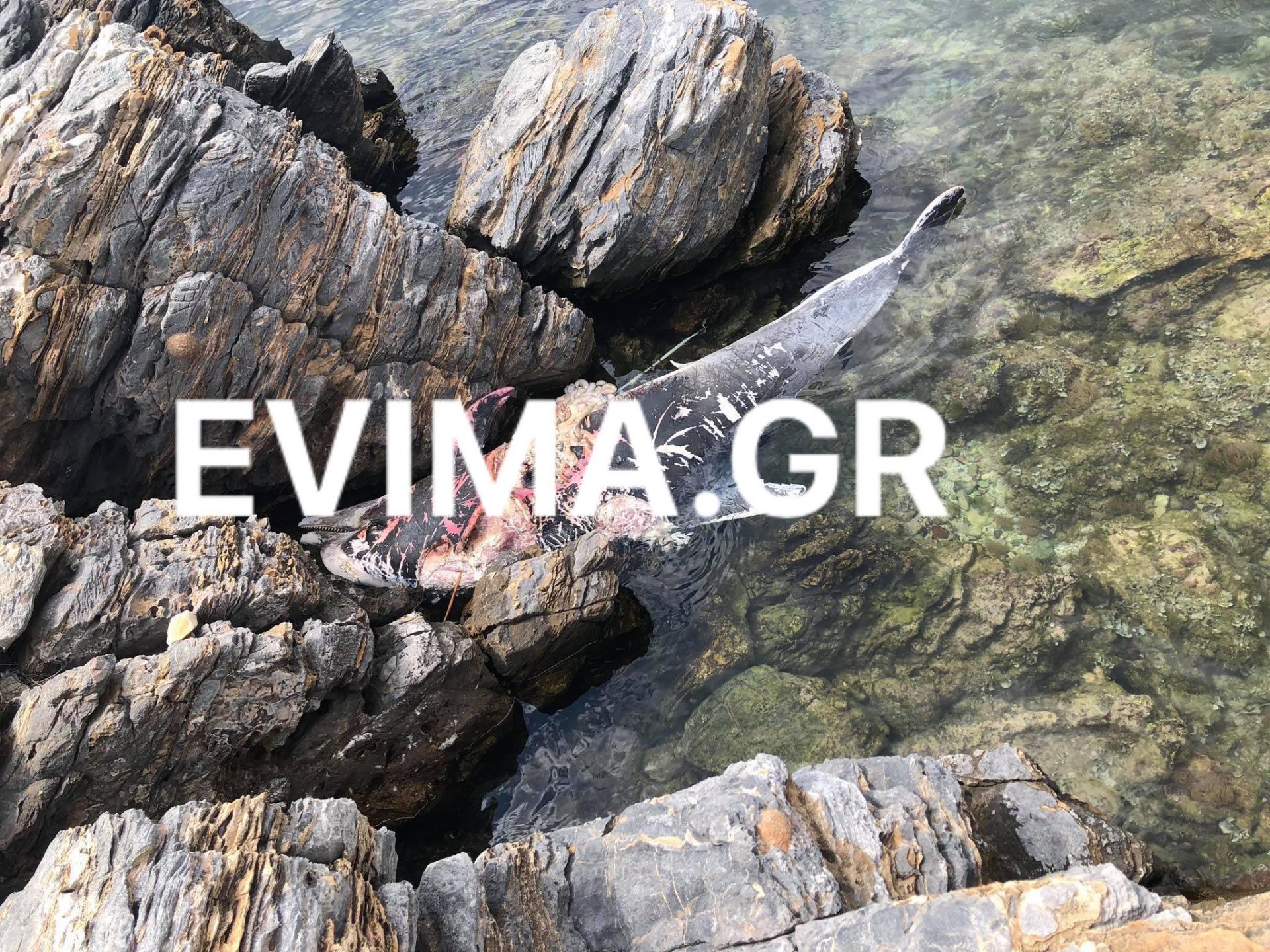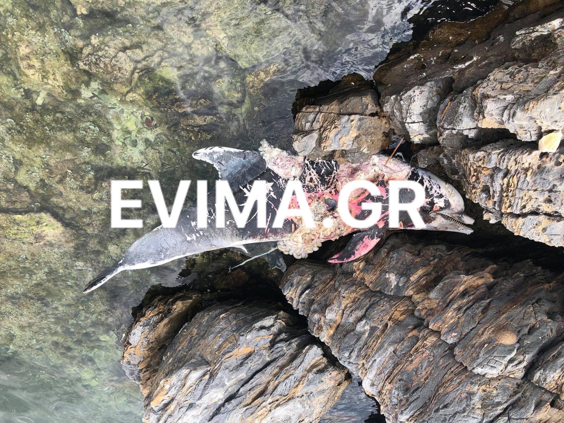 Οι λουόμενοι έμειναν έκπληκτοι όταν είδαν το δελφίνι που φαίνεται στις φωτογραφίες να είναι γδαρμένο και δεμένο στα βράχια.