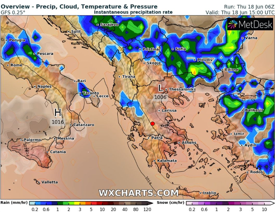Σήμερα Πέμπτη στην ανατολική Μακεδονία και τη Θράκη προβλέπονται τοπικές βροχές και σποραδικές καταιγίδες κυρίως τις μεσημβρινές και απογευματινές ώρες. Στην υπόλοιπη χώρα γενικά αίθριος καιρός, με τοπικούς όμβρους στα ηπειρωτικά ορεινά τις μεσημβρινές και απογευματινές ώρες. Οι άνεμοι θα πνέουν από δυτικές διευθύνσεις στα νότια βαθμιαία έως 7 μποφόρ.