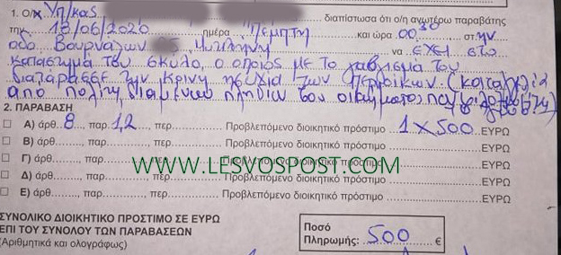 Το πρόστιμο των 500 ευρώ καλείται να πληρώσει ένας καταστηματάρχης στην Μυτιλήνη διότι ο σκύλος – φύλακας που έχει στο μαγαζί του γαύγισε και ενόχλησε έναν γείτονα.