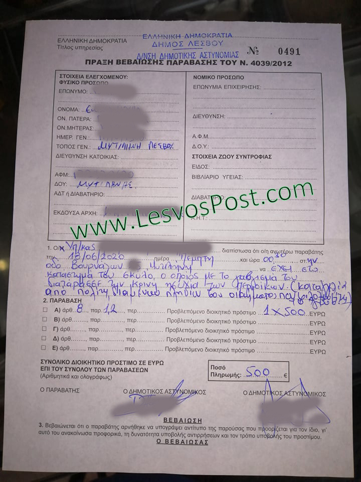 Όπως κατήγγειλε στο LesvosPos, το τετράποδο το έχει μέσα στον χώρο του καταστήματος και η καταγγελία έγινε επειδή γαύγιζε τα μεσάνυχτα, με αποτέλεσμα πλέον να καλείται να πληρώσει 500 ευρώ!