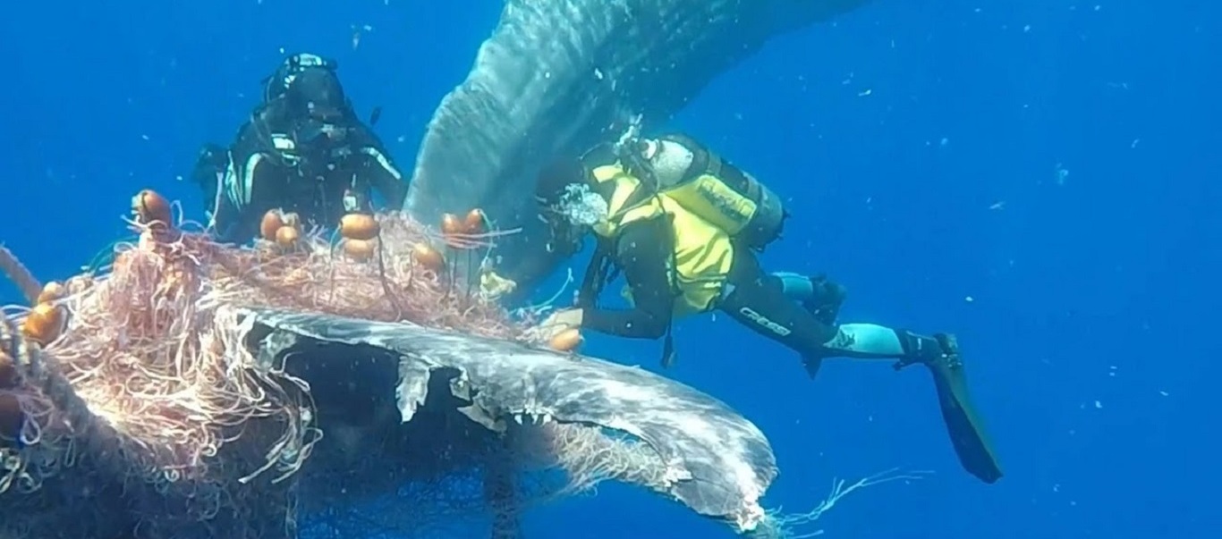 Η φάλαινα φυσητήρας είχε παγιδευτεί σε παράνομα αλιευτικά δίχτυα και δεν μπορούσε να συνεχίσει την πορεία της, στη θάλασσα. Οι δύτες δυσκολεύτηκαν αρκετά για να την ελευθερώσουν, λόγω του μεγέθους της.