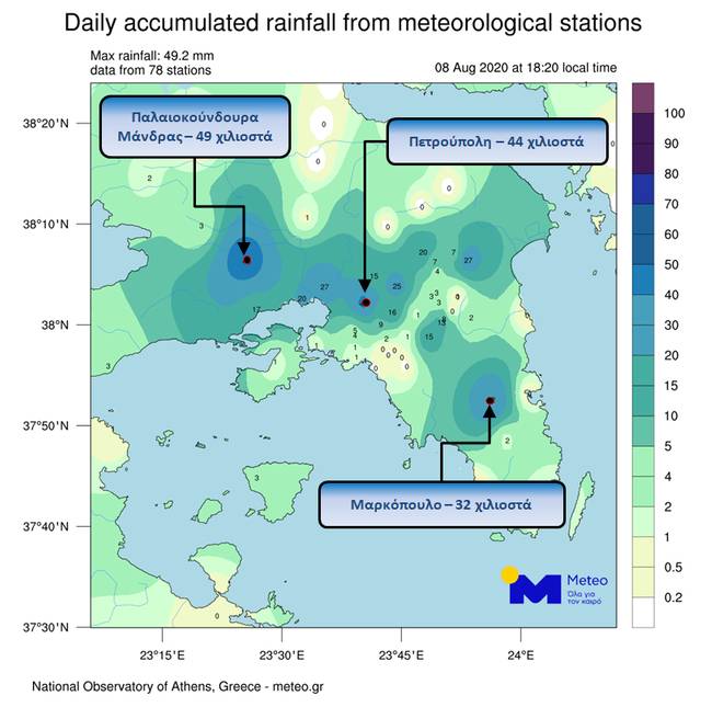 ​Όπως φαίνεται, τα μεγαλύτερα ύψη έχουν καταγραφεί στον πρόσφατα τοποθετημένο σταθμό στα Παλαιοκούνδουρα Μάνδρας (49 χιλιοστά), στο σταθμό της Πετρούπολης (44 χιλιοστά) και σε αυτό του Μαρκόπουλου (32 χιλιοστά).