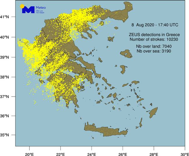 Το δίκτυο καταγραφής κεραυνών «ΖΕΥΣ» του Εθνικού Αστεροσκοπείου Αθηνών, κατέγραψε έως το βράδυ του Σαββάτου 8 Αυγούστου κατά κύριο λόγο στο Ιόνιο και στην ηπειρωτική χώρα, 10.000 κεραυνούς.