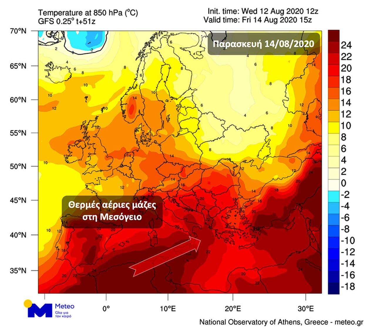 Η ατμοσφαιρική κυκλοφορία στην Ευρώπη θα συνεχίσει να ευνοεί τη μεταφορά θερμών αερίων μαζών από τη Βόρεια Αφρική προς τη χώρα μας, τόσο την Πέμπτη 13/08 όσο και την Παρασκευή 14/08, με τη θερμοκρασία να παραμένει σχεδόν αμετάβλητη, σύμφωνα με την πρόγνωση του Εθνικού Αστεροσκοπείου Αθηνών.