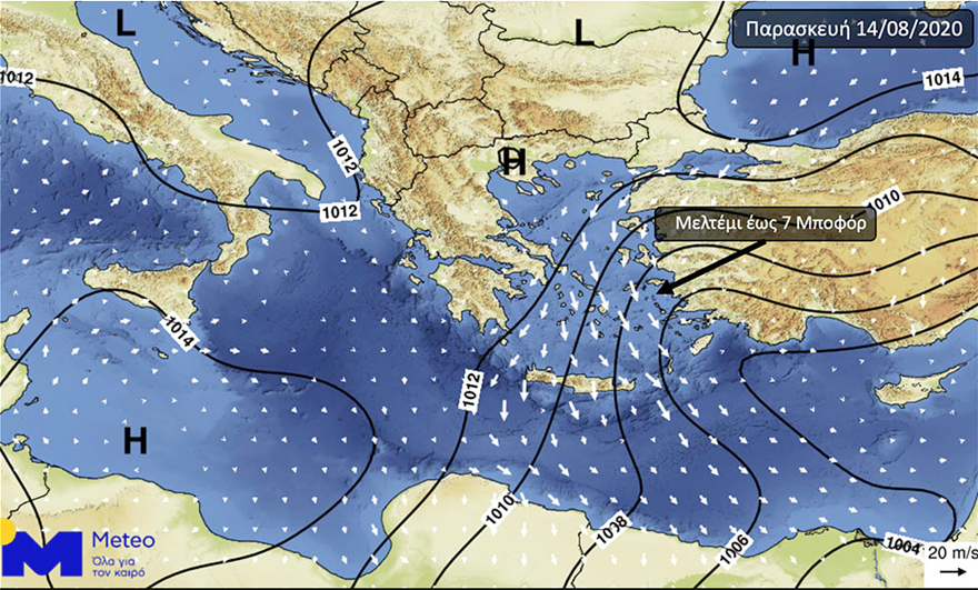 Παράλληλα το μελτέμι στο Αιγαίο Πέλαγος θα συνεχίσει να πνέει ενισχυμένο, φτάνοντας τοπικά τα 7 Μποφόρ στις Κυκλάδες και τα Δωδεκάνησα.