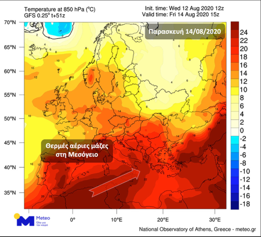 Η ατμοσφαιρική κυκλοφορία στην Ευρώπη θα συνεχίσει να ευνοεί τη μεταφορά θερμών αερίων μαζών από τη Βόρεια Αφρική προς τη χώρα μας σήμερα Πέμπτη, αλλά και την Παρασκευή 14/08, με τη θερμοκρασία να παραμένει σχεδόν αμετάβλητη.