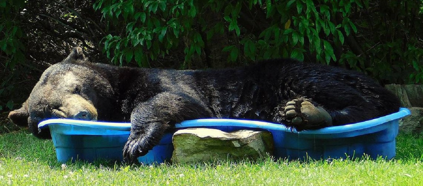 Μια μεγάλη μαύρη αρκούδα «λύγισε» από τις υψηλές θερμοκρασίες που επικρατούσαν στην περιοχή κι έκανε «βουτιά» σε μια παιδική πισίνα, για να δροσιστεί.