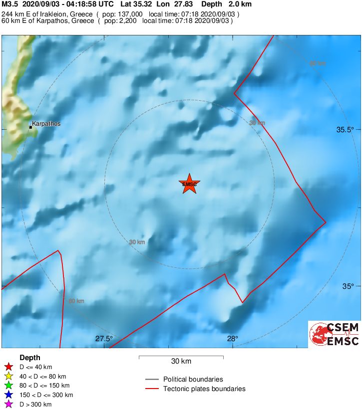Σεισμική δόνηση μεγέθους 3,5 βαθμών της κλίμακας Ρίχτερ σημειώθηκε το πρωί της Πέμπτης 3 Σεπτεμβρίου και συγκεκριμένα, στις 07:18, σε θαλάσσια περιοχή, νοτιοανατολικά της Καρπάθου.