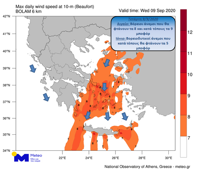 Σύμφωνα με τα τελευταία προγνωστικά δεδομένα του Εθνικού Αστεροσκοπείου Αθηνών/meteo.gr, το μελτέμι θα ενισχυθεί αύριο Τετάρτη, φτάνοντας τα 8 και τοπικά τα 9 μποφόρ, ενώ στο Ιόνιο οι άνεμοι δεν θα ξεπερνούν τα 5 μποφόρ.