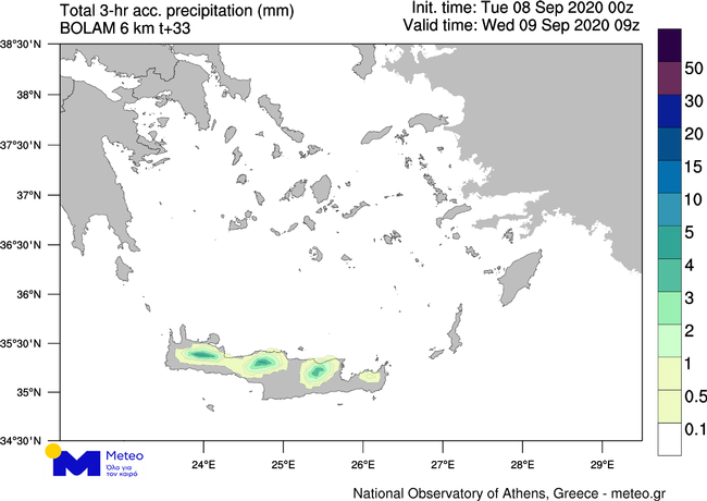 Παράλληλα, αυξημένη είναι αύριο η πιθανότητα εκδήλωσης βροχοπτώσεων στην Κρήτη και κυρίως στα βόρεια και ορεινά του νησιού, ενώ πιθανότητα τοπικών βροχών υπάρχει επίσης στη Νότια Εύβοια και στις Κυκλάδες. Στον παρακάτω χάρτη παρουσιάζεται ενδεικτικά η αναμενόμενη βροχόπτωση το μεσημέρι της Τετάρτης 09/09 στα νοτιοανατολικά διαμερίσματα της χώρας.