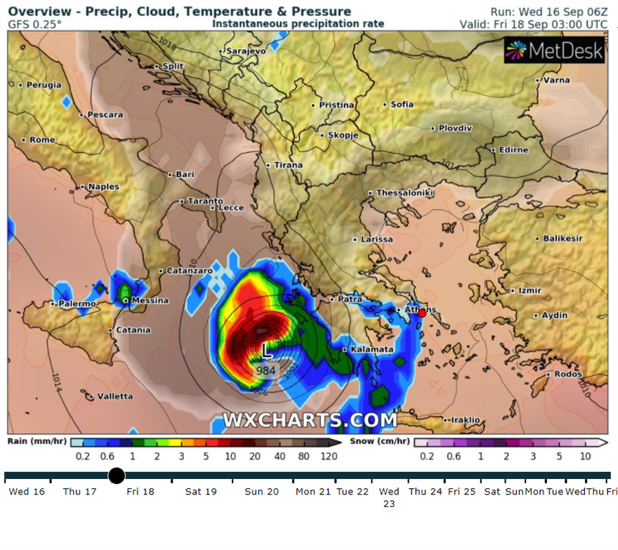 Στον χάρτη καταγράφεται το κύμα κακοκαιρίας που πλησιάζει την Αθήνα τα ξημερώματα της Παρασκευής