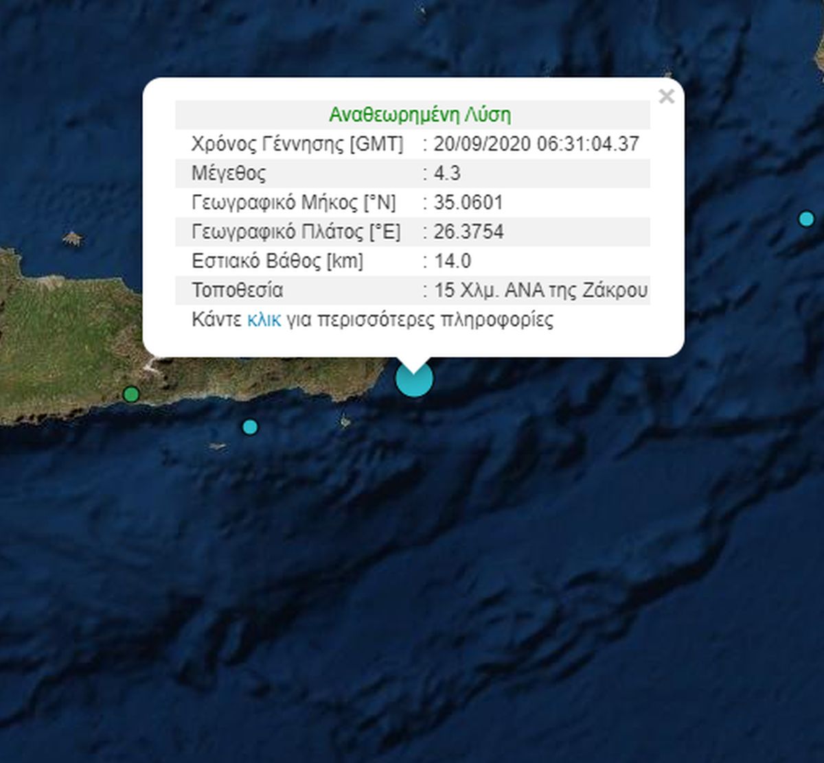 Το επίκεντρο του σεισμού εντοπίζεται 15 χλμ., ανατολικά της Ζάκρου.