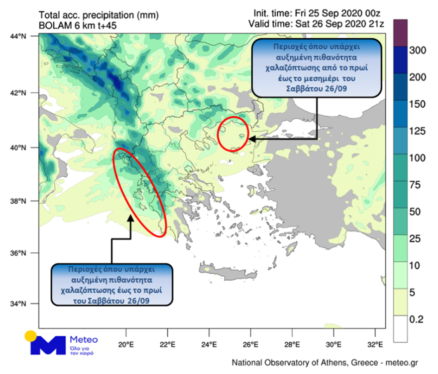 Πιθανότητα χαλαζόπτωσης υπάρχει έως το πρωί του Σαββάτου 26/09 στο Ιόνιο και στα δυτικά ηπειρωτικά και από το πρωί έως το μεσημέρι της ίδιας ημέρας στη Θράκη και στο Βόρειο Αιγαίο. Στο χάρτη που ακολουθεί φαίνεται ο ολικός υετός που αναμένεται έως το βράδυ του Σαββάτου 26/09. Τη Κυριακή 27/09 φαινόμενα μικρότερης ισχύος αναμένονται κατά κύριο λόγο στο Ιόνιο, στα δυτικά ηπειρωτικά και στα Δωδεκάνησα.
