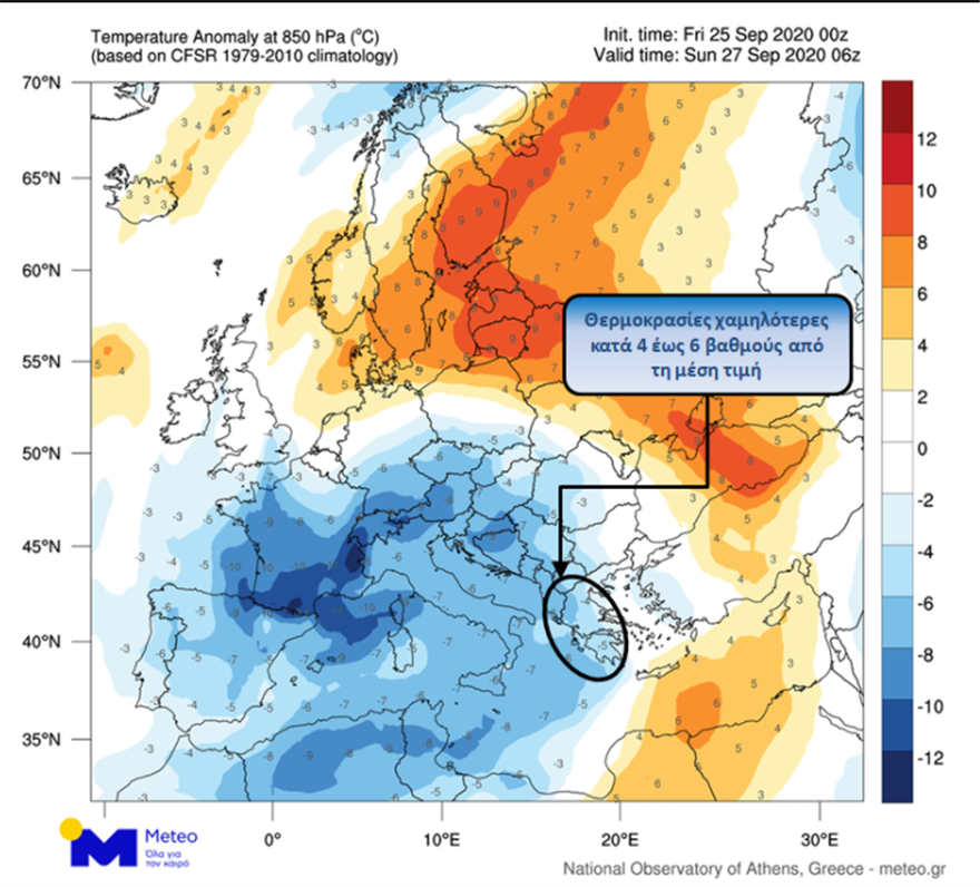 Στο χάρτη του meteo που ακολουθεί παρουσιάζεται η απόκλιση της θερμοκρασίας σε ύψος 1500 μέτρων πάνω από το έδαφος σε σχέση με την μέση τιμή των ετών 1979 – 2010, για το πρωί της Κυριακής. Με κόκκινες αποχρώσεις φαίνονται οι υψηλότερες από τη μέση τιμή θερμοκρασίες ενώ με γαλάζιες οι χαμηλότερες. Όπως προκύπτει από αυτόν, οι θερμοκρασίες που αναμένονται στα ηπειρωτικά και στο Ιόνιο θα είναι 4 έως 6 βαθμούς χαμηλότερες από τη μέση τιμή.