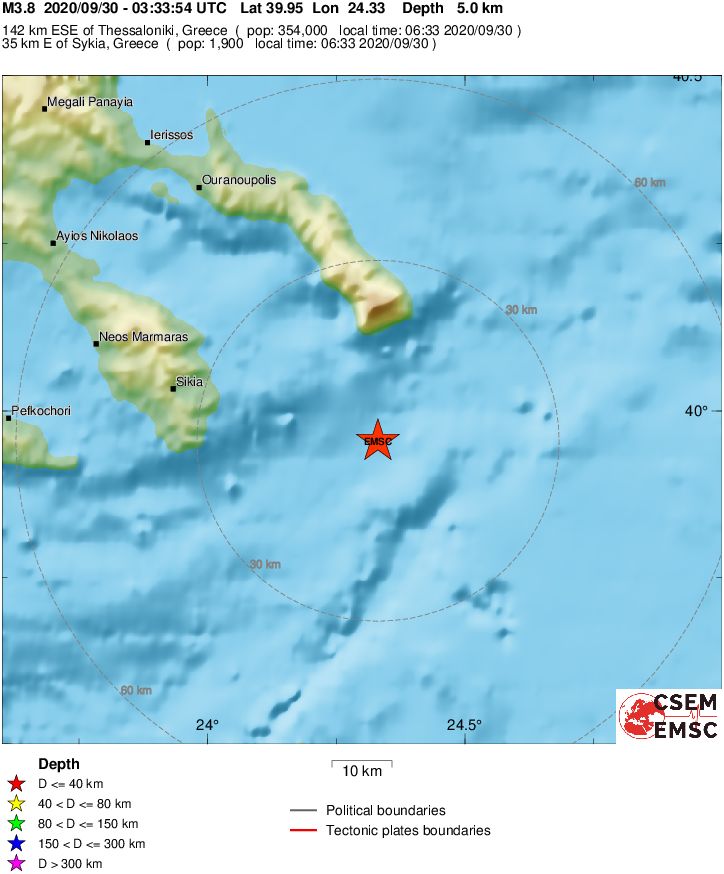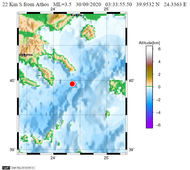 H αυτόματη λύση του Γεωδυναμικού Ινστιτούτου του Αστεροσκοπείου Αθηνών δίνει το σεισμό στα 3,7 Ρίχτερ, με εστιακό βάθος τα 8,5 χλμ., και επίκεντρο τα 22 χλμ. νοτιοδυτικά του Άθου.
