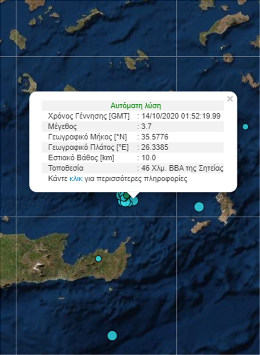 Σεισμός μεγέθους 3,7 βαθμών της κλίμακας Ρίχτερ σημειώθηκε στις 04.52 τα ξημερώματα βορειοανατολικά της Σητείας, σύμφωνα με το Γεωδυναμικό Ινστιτούτο του Εθνικού Αστεροσκοπείου Αθηνών.