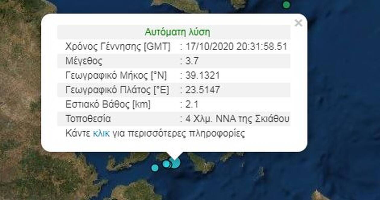 Το επίκεντρο του σεισμού εντοπίζεται 4 χλμ. νοτιοανατολικά της Σκιάθου.