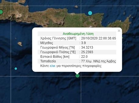 Σεισμική δόνηση μεγέθους 3,9 βαθμών της κλίμακας Ρίχτερ σημειώθηκε σήμερα 21 Οκτωβρίου τα ξημερώματα νότια της Κρήτης.
