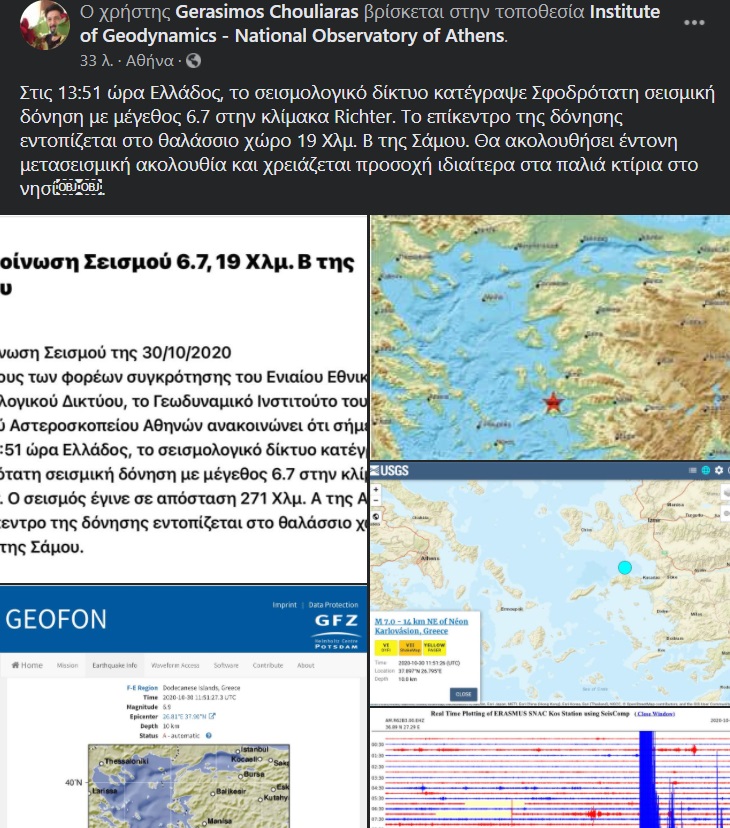 «Στις 13:51 ώρα Ελλάδος, το σεισμολογικό δίκτυο κατέγραψε Σφοδρότατη σεισμική δόνηση με μέγεθος 6.7 στην κλίμακα Richter. Το επίκεντρο της δόνησης εντοπίζεται στο θαλάσσιο χώρο 19 Χλμ. Β της Σάμου. Θα ακολουθήσει έντονη μετασεισμική ακολουθία και χρειάζεται προσοχή ιδιαίτερα στα παλιά κτίρια στο νησί».