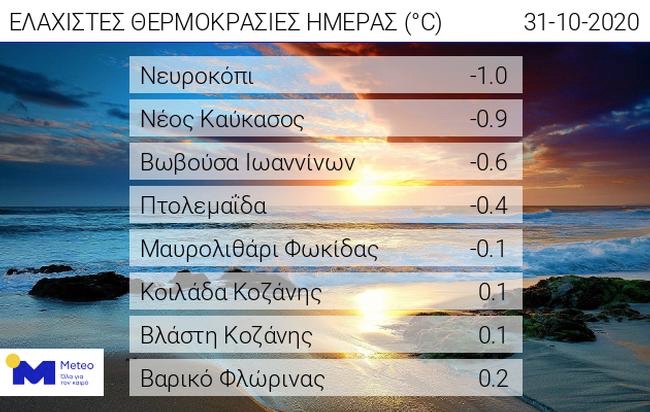 Σύμφωνα με το δίκτυο αυτόματων μετεωρολογικών σταθμών του Εθνικού Αστεροσκοπείου Αθηνών / Meteo.gr, οι χαμηλότερες ελάχιστες θερμοκρασίες τις πρωινές ώρες του Σαββάτου 31/10, παρουσιάζονται στον παρακάτω Πίνακα.
