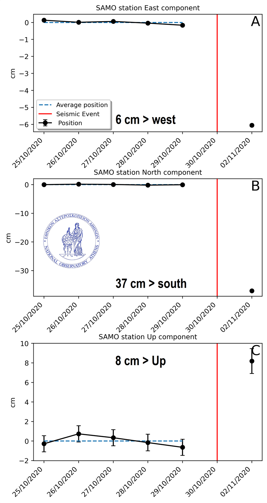 Όπως επισήμανε ο κ. Γκανάς, «Αυτό προέκυψε από την διαφορά θέσης του σταθμού GPS πριν και μετά τον σεισμό της Παρασκευής. Αυτή η μεγάλη μετατόπιση έγινε γιατί το Καρλόβασι είναι ακριβώς απέναντι από το κέντρο του σεισμικού ρήγματος».