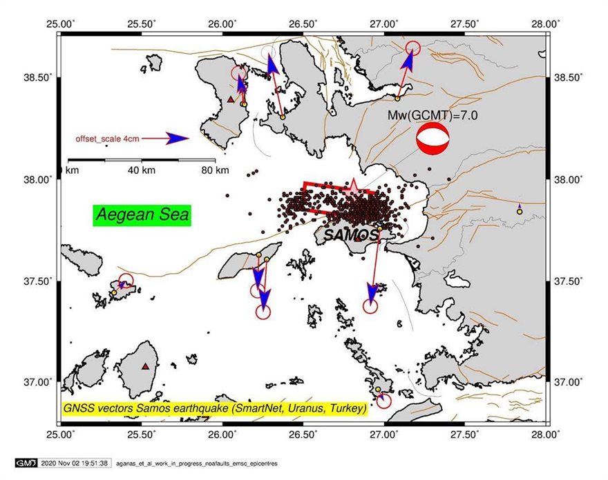 «Σύμφωνα με τα ανύσματα μετατόπισης που μας δείχνουν πως κινήθηκε το έδαφος. Έτσι η Σάμος μετακινήθηκε 6,5 εκατοστά το Βαθύ και έχουμε και τη μεγαλύτερη μετατόπιση που έχει καταγραφεί μέχρι σήμερα και είναι 37 εκατοστά στο Καρλόβασι. Όλο το νησί μετατοπίστηκε προς νότο, αλλά όχι το ίδιο σε όλα τα σημεία. Το Καρλόβασι μετατοπίστηκε τόσο γιατί είναι πιο κοντά στο ρήγμα. Αυτές οι αλλαγές έγιναν μέσα σε 20 δευτερόλεπτα όσο διήρκησε η διάρρηξη. Μετατοπίστηκε η Σάμος, η Ικαρία και η ακτή της Μικράς Ασίας. Η Σμύρνη μετατοπίστηκε 4 εκατοστά προς το βορρά», εξηγεί ο κ. Γκανάς.